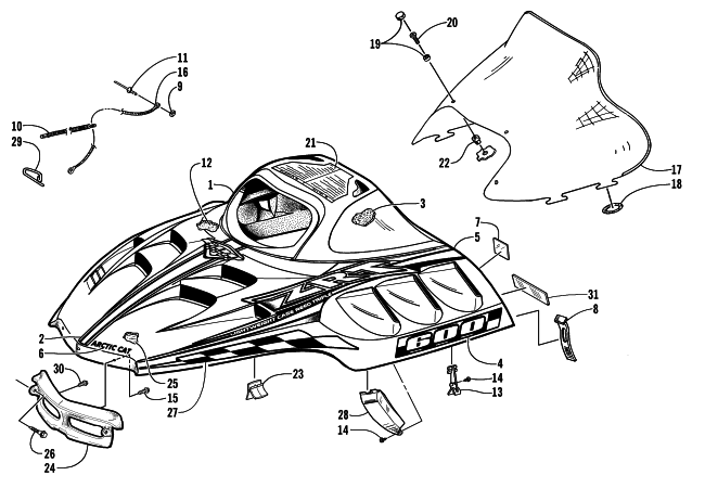 Parts Diagram for Arctic Cat 1999 ZRT 600 SNOWMOBILE HOOD AND WINDSHIELD ASSEMBLY