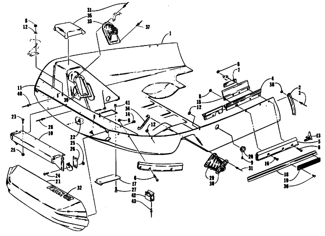 Arctic Cat Parts for 1991 JAG AFS LONG TRACK SNOWMOBILE BELLY PAN AND NOSE CONE ASSEMBLIES